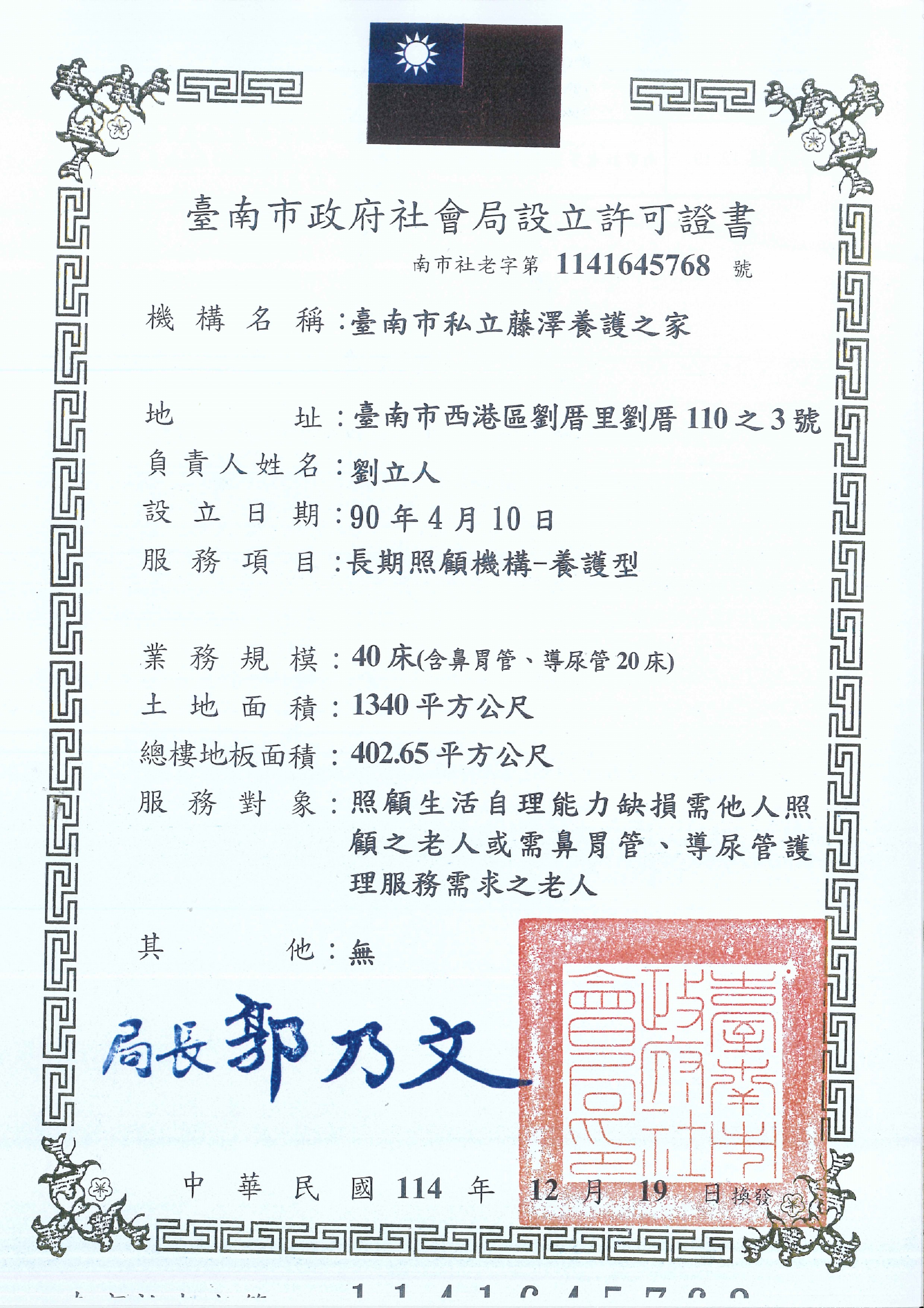 “藤澤養護之家”( 臺南縣政府核准社福老証字第0一六號 )